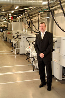 Somogyi Imre lesz januártól a Parkettagyár igazgatója, hisz a sikeres felületkezelő sor beruházást követően idén december végével Várkonyi Gábor nyugdíjba megy. Dóka Károly, a FAGÉPSZER Kft ügyvezető igazgatója a mintegy száz m hosszú felületkezelő sor előtt.