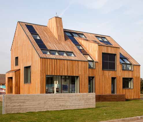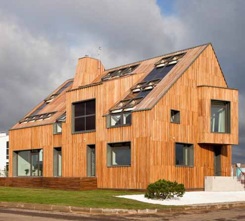 Anyaghasználat A házat Moszkva kontinentális éghajlati adottságaihoz alkalmazkodva tervezték meg, hogy egyaránt megfelelően teljesítsen a meleg nyarak és a hosszú, hideg telek alkalmával is. Az alkalmazott építőanyagok nagyrészt újrahasznosíthatóak. A homogén anyaghasználat az orosz építési hagyományokra utal, emellett a faburkolat tartós és alacsony a beépített CO2-tartalma. A pilléralapokon nyugvó ház fenyőfa vázszerkezetét a helyszínen szerelték össze. Az épület valódi viselkedését folyamatosan figyelik és adatokat gyűjtenek róla; ezek elemzése segít majd meghatározni az alkalmazott építészeti és műszaki megoldások hatékonyságát.