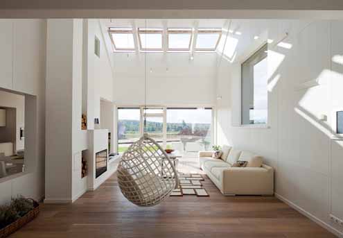 Építészeti koncepció A ház arányai és méretei a modern megközelítéseket a hagyományos építészeti formákkal ötvözik. A kelet-nyugati tájolású épület koncepciója a kint és bent közötti kapcsolaton, illetve a geometria és a fény közötti kölcsönhatáson alapul. A nagyméretű nyílásoknak köszönhetően a helyiségekből más és más látvány tárul fel az egyre sűrűsödő beépítésű környezetre és a távolabbi tájra. A kompakt, archetipikus tömegformához különféle funkcionális elemek kapcsolódnak, mint például a terasz és a kémény. A helyiségek elrendezését elsősorban a használhatóság követelményei szabták meg, az eredmény mégis különleges lett: a szokványosnak tűnő alaprajz a meredek tetőnek köszönhetően tágas, akár két szint magasságát átfogó terekkel párosul. A földszinten helyezkednek el a közösségi funkciók, a konyha, a nappali és egy irodatér. A magánszféra helyiségei az emeleten találhatók, a szülői háló mellett két kisebb szoba és fürdő kapott helyet. A két szint között kapcsolatot teremtő, tágas nappali a nagy megnyitásoknak köszönhetően napfényben fürdik. A homlokzati ablakokat úgy helyezték el, hogy szinte keretezzék a ház körüli erdő és dombvidék feltáruló látványát. A több sorban elhelyezett tetőablakok révén a szobák mindegyike jól megvilágított.