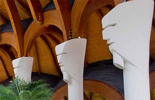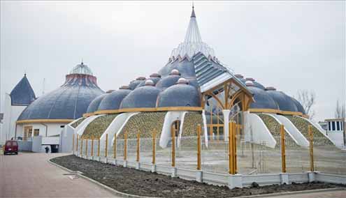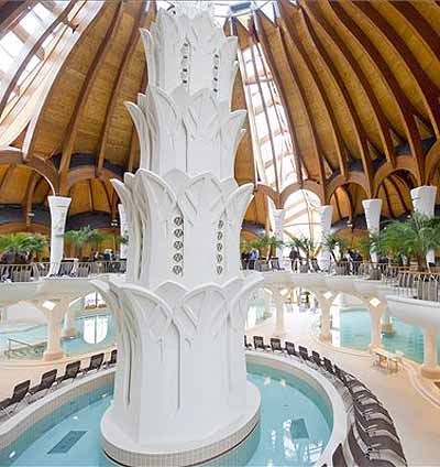A 12 ezer négyzetméteres alapterületű fürdőkomplexum, amely formáját meghatározzák a Makovecz Imre épületeire jellemző ívelt kupolák, égbetörő kecses oszlopok és a ragasztott fa tetőszerkezetek négy funkciójában és stílusában is elkülönülő részre osztható.
