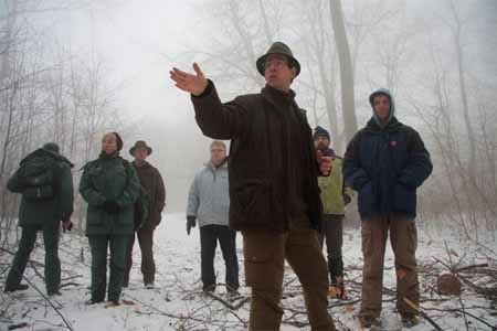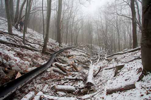 A Pilisszentkereszti Erdészet területén megszervezett bemutatóra a Duna-Ipoly Nemzeti Park kollégái is elkísértek minket. A dobogókői elágazástól nem messze megérkeztünk a helyszínre. Bár az idei tél meglehetősen enyhe, erre a napra tökéletes időt hozott. Hó esett ugyanis előző éjjel, és köztudott, hogy fát kitermelni legjobb fagyott talajon, kellően vastag hótakaró mellett.