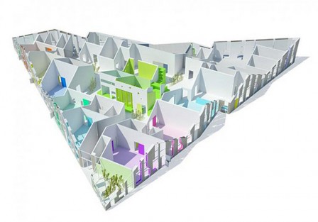 Arányait, felépítését és térelrendezését tekintve az épület leginkább egy kis falura hasonlít: a három részre osztott belső teret utcák, átjárók és fülkék tagolják. Forrás: Passzívház Magazin