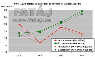 A lényeg, hogy természetes mértékegység csak a nyolcjegyű tarifaszámos megnevezésekhez van. Ha ezen sorok értékadatait (Ft, Euró) akár export, akár import esetében bármely évnél összeadjuk, az nem teszi ki a négyjegyű (jelen esetben 4401-es) számmal azonosított termékcsoport összesen adatát, csak attól kevesebbet mutat. Ennek oka, hogy mióta Magyarország is az EU tagja és az áruk EU-n belül határainkon szabadon mozognak, az EU-n belüli külforgalmunkra nincs teljes lefedettségű határstatisztika. Ilyen csak az EU-n kívüli árumozgásra készül. Hogy mégis tudni lehessen az ország EU-n belüli külforgalmát - a többi EU tagország gyakorlatához hasonlóan - a KSH kijelölte, felkérte a külkereskedelem 94-97%-át forgalmazó mintegy 10.000 céget külforgalmukról adatszolgáltatásra. A fennmaradó 3-6%-ot pedig a KSH munkatársai tapasztalatuk és szaktudásuk alapján megbecsülik. Ezért az alábbi grafikonokon a Tűzifa termékcsoport összesen (tehát a becsült részt is tartalmazó) és az EU-n kívüli határstatisztikára + a kijelölt adatszolgáltatók EU-n belüli adatközlésére támaszkodó adatsort is bemutatom. 2008-ban e termékcsoportban a becslési hányad viszonylag magas volt (36% és 14%), de a további években csak 4-12% közöttiek ezek az értékek.
