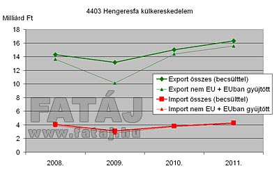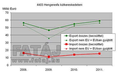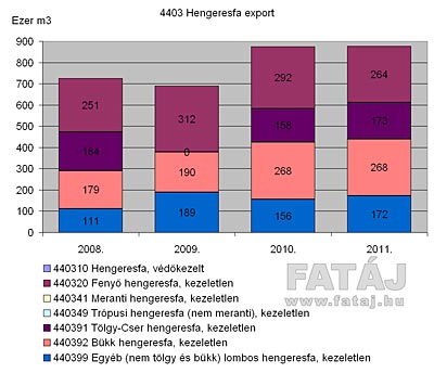 Az export nagyobbik részét a lombos fafajok teszik ki. Látható a 2009. évi tölgy adat hiánya. Az exportált fenyő minősége jellege pedig egészen más mint az importé. Az import elsősorban szelvényáru termelésre alkalmas, míg az export zömében papírfa-rostfa, ami a hazai termőhelyi adottságok következménye. 2010-ről 2011-re a hengeresfa export mennyisége, és összetétele is szinte változatlan, egyben mindkét esetben meghaladja a válság előtti 2008. évit.