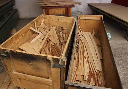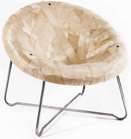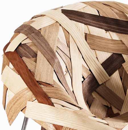 A foteleket parkettaszerű darabokból [Nevezzük inkább furnér-eseléknek! FATÁJ szerk.] ragasztották össze. A furnéranyagok mindegyike teljesen egyedi, így az újrahasznosított fotelból sosem készül két egyforma.