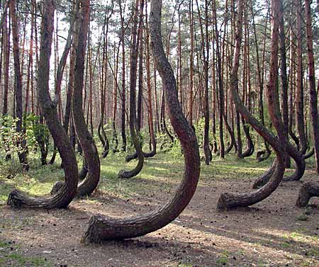 A fenti kép a Green Renaissance Facebook oldaláról való, amelyben sok egyéb érdekes kép is van, pl. a görbefák. A kép forrása. Egy nyugat-lengyelországi erdőben mintegy 400 erdeifenyő 90 fokos kanyart vett, majd onnét nagy ívvel egyenesedett ismét az ég felé. Mindegyik kanyarulat északi irányú. E kis részletet normális, egyenes fákból álló erdő veszi körül. Relytély, hogy jöhetett létre ez az alakzat e kis részletben. Az erdőt 1930. körül telepítették és 7-10 évi növekedés után feltehetően emberi mechanikai behatással a fákat lefogták. Nem sikerült kideríteni, hogy az erdőgazdálkodó annak idején miért akart ilyen sok görbefát. (Eredeti szöveg: Discovery News)