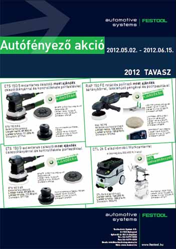 Festool autófényező akció már csak 2 hétig! 2012.06.15-ig az alábbi modellek érhetőek el rendszertartozék ajándékokkal: ETS 150/3 excenteres csiszoló, ETS 150/5 excenteres csiszoló, RAP 150 FE rotációs polírozó, CTL 26 E elszívómobil! A gépekhez járó ajándékokat fedezze fel Ön!