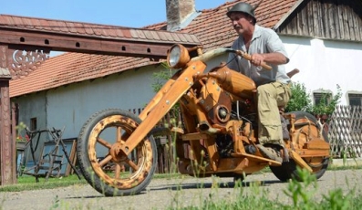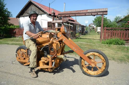 Múlt héten vonult le a Harley-Davidson találkozó, ám vizuális utórezgésként itt van egy gyöngyszem: Puskás István traktoros akácból épített motorkerékpárjával "repeszt" tiszaörsi háza előtt. A férfi két év alatt építette meg fa-chopperét, amelyet egy 126-os Polski Fiat motor gyorsít fel 25-30 kilométer/órás végsebességére.