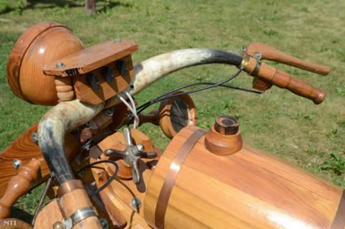 Puskás István első próbálkozása egy chopper volt, ebbe 50 köbcentis Simson motort tett, de túlságosan gyengének ítélte. Ezért építette meg legújabb büszkeségét. - Amikor elkezdtem a vázat összerakni, még fenyőfát használtam, de nem tetszett a színe - idézte fel István. Puskás István ritkán veszi elő féltett kedvencét, de akkor meghajtja az úton. - Simán, benzinnel kell tankolni - magyarázta István nevelt fia, Tóth István. - A tankja egy fából készült boroshordó. A kormány és a kipufogó szürkemarha-tülökből van.