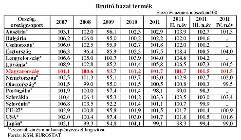 Hazai folyamatok 2011. IV. negyedévében a bruttó hazai termék 1,4%-kal bővült - kiigazítatlan adatok alapján - az egy évvel korábbi 1,9%-os növekedés bázisán. A 2011. évi növekedés átlagban 1,7%-os bővülést eredményezett. Az előző negyedévhez viszonyított - szezonálisan és naptárhatással kiigazított - index 0,3% volt. A szezonálisan és naptárhatással kiigazított index szerint 1,5%-os volt az emelkedés az egy évvel korábbihoz képest, ezzel az uniós tagállamok rangsorában a középmezőny végén helyezkedünk el. A rendelkezésre álló adatok alapján egyértelmen leszűrhető, hogy a növekedés motorja továbbra is az ipari termelés és a termékek és szolgáltatások külkereskedelme, valamint a mezőgazdasági termelés volt.