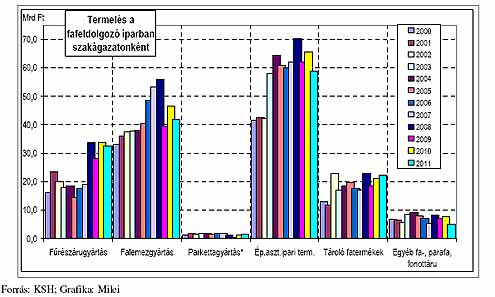 2,8%-os növekedést követen, 2011-ben 19,5%-kal csökkent. A fafeldolgozó ipar 2011 decemberében a január óta tartó termeléscsökkenés megállt, az 5,7%-os növekedés az