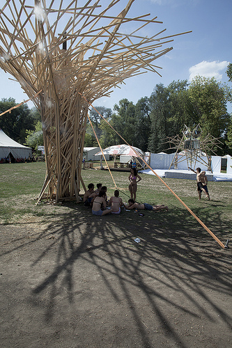 A Tornádó közelében épült fel Huszár András, Mechle Balázs és Nagy Nándor építészek alkotása a Lounge pihenőhely, amelyet a Moholy-Nagy Művészeti Egyetemen végzett hallgatók alkotásai egészítenek ki lampionokkal és szalag installációval. A szatén szalagos installáció alkotóinak, a Prehuman Syndicate csoport tagjainak, Mindák Gergelynek és N. Iván Katának célja az igényes művészet becsempészése a hétköznapi élet tereibe. A fás ligetben stilizált csermelyként különböző irányokból érkező színes szalagkötegek áramlanak a lombok között, egyszerre mozduló, áramló, lélegző mintázatként, természetközeli, letisztult formákkal. A szalagok jelképezik a különféle emberek, kultúrák párhuzamosan zajló, egyéni, mégis közös történetet alkotó, egy irányba mutató útját, az egymásra találást, az együtt áramlást, az egy közegként rezdülést. A Lounge kényelmes, kellemes tartózkodóhely a bor, fröccs és pálinka szerelmeseinek. A Hello Wood alkotótáborban készült Úszóház installáció a Lázbérci víztározóról kerül át a Szigetre. A Nagy Nándor, Szabó Bulcsú és Huszár András vezetők és csapataik által épített alkotás eredeti funkciója a fürdőházak hagyományának megújítása, azonban szárazföldön is különleges térélményt biztosít a látogatóknak. A kívülről doboz, belülről organikusan változó fa alkotás 8 méter x 4 méter x 3 méteres.