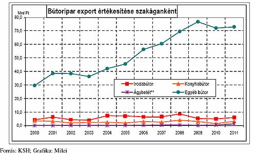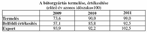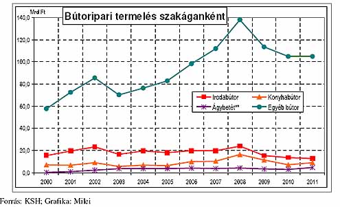A bútorgyártás (TEÁOR 31) 2011. január-decemberi termelési értéke 131.119,0 millió Ft, belföldi árbevétele 47.925,6 millió Ft, export árbevétele 83.193,4 millió Ft volt. A bútoripar termelése 2011-ben 1%-kal csökkent, az egy évvel korábbi 10%-os visszaesés bázisán. A bútoripar hazai eladásai a 2010. évi 14,2%-os visszaeséssel szemben 2011. január-decemberében további 7,5%-kal csökkent. A bútoripari export ugyanakkor 2,5%-kal haladta meg az egy évvel korábbit. 2011. decemberében a bútoripar termelése 1,6%-kal, belföldi értékesítése 5,6%-kal csökkent, export értékesítése pedig 2,4%-kal ntt 2010. decemberéhez képest. Az ágazat 2011 negyedik negyedévi teljesítménye is hasonlóan alakult, a termelés 1,6%-kal, a belföldi értékesítés 4,9%-kal esett vissza, az export 1%-os növekedése mellett.