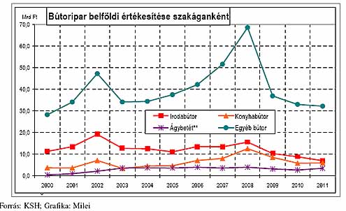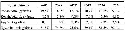 Az irodabútorok gyártása területén 2008 év végén megindult kedvezőtlen folyamatok tovább erősödtek 2009-ben. 2010-ben változatlanul a negatív tendenciák érvényesültek, de a korábbi ütem enyhült. 2011-ben folytatódott a több mint két éve tartó visszaesés. A szakág termelése 9,1%-kal, belföldi értékesítése 23,6%-kal csökkent, kivitele ugyanakkor 18,9%- kal emelkedett, mindez igen alacsony előző évi bázison. Az egyes negyedévek teljesítménye közel azonos volt 2011-ben, mind a termelés, mind a hazai értékesítés területén. A kivitel növekedési üteme a második félévben megfeleződött az első félévhez képest. Ugyanakkor a IV. negyedévi növekedés (+10,6%) kismértékben meghaladta a harmadik negyedévit (+9,2%). 2011. decemberében a termelés 1,6%-kal, a kivitel is 231,8%-kal bővült, míg a belföldi értékesítés 24%-kal esett.