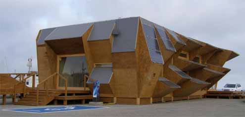 Közelebb kerülve enyhül a kép. A fényes napelem-pikkelyeket hegyes natúr fa felületű ékekre építették, és üvegtáblákon keresztül a szokatlan forma belsejébe is bepillanthatunk. Az építmény a Distributed Intelligence (megosztott intelligencia) koncepcióját az építészet nyelvére lefordító kísérleti pavilon, melyet Endesa Pavilion, Solar House 2.0 elnevezéssel a novemberben megrendezésre kerülő Smart City Expo előhírnökeként állították fel a katalán főváros Olimpiai Kikötőjében.