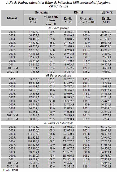 A fa alapanyagok 2012 I. negyedévi külkereskedelmi forgalma pozitív egyenleggel zárt, mértéke meghaladja a 9,5 milliárd forintot, ami közel 5 milliárd forinttal múlja felül az egy évvel korábbit. A behozatal forintban 13,2%-kal, kivitelünk pedig 38,2%-kal nőtt. A fatermékek kivitele ez év első negyedévében 16,2%-kal emelkedett, míg behozatalunk 23,5%-kal n őtt. Az egyenleg lényegében nem változott az egy évvel korábbihoz képest. 2012 január-márciusban a bútor és bútorelem behozatal 32,6%-kal bővült. Az árucsoport kivitele a vizsgált időszakban 29,1%-kal emelkedett az egy évvel korábbihoz képest. Az árucsoport egyenlege 13,1 milliárd forinttal kedvezőbben alakult, mint az előző évben.