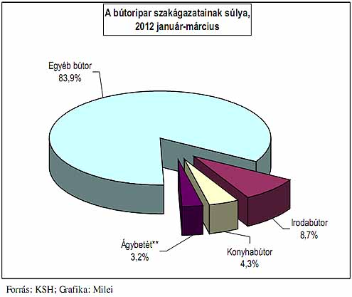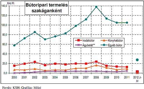 BÚTORIPAR Az irodabútorok gyártása területén 2008 év végén megindult kedvezőtlen folyamatok tovább erősödtek 2009-ben. 2010-ben változatlanul a negatív tendenciák érvényesültek, de a korábbi ütem enyhült. 2011-ben folytatódott a több mint két éve tartó visszaesés. 2012 első három hónapjában sem fordult meg az előző évek negatív tendenciája, mind a termelés, mind az értékesítés csökkent. A szakág termelése 7,7%-kal, belföldi értékesítése 15,8%-kal, kivitele 5%-kal csökkent, mindez a termelés és hazai értékesítés esetében igen alacsony előző évi bázison. 2012 márciusában a termelés 25,5%-kal, a belföldi értékesítés 34,4%-kal, a kivitel pedig 19,1%-kal csökkent a múlt évi magas bázishoz képest. A negyedéven belül januárban még igen erős növekedés mutatkozott, februárra azonban már jelentős visszaesésbe fordult az alágazat tevékenysége.