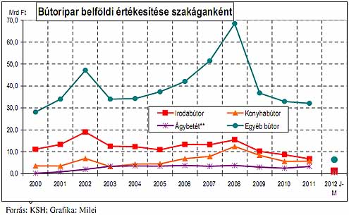 2008-ban a konyhabútorgyártás termelése 52,1%-kal, a kivitel 36,3%-kal, a belföldi értékesítés 57,4%-kal emelkedett. A 2009-ben bekövetkezett negatív fordulat 2010-ben tovább folytatódott, a visszaesés üteme változatlan mértékű. 2011-ben részleges fordulat következett be: a termelés 12,8%-kal az export 92,2%-kal n őtt 2010-hez képest. A belföldi értékesítés még mindig gyengélkedik (építőipar gyenge teljesítménye, lakossági és intézményi fogyasztás csökkenése), 7,3%-os visszaesést mutat. 2012 I. negyedévében - az építőipar változatlan gyengélkedése és a külföldi piacok lendületvesztése miatt - jelentősen csökkent a konyhabútor gyártás és értékesítés. A termelés 36,6%-kal, a belföldi érékesítés 35,3%-kal, a kivitel 39,5%-kal esett vissza. 2012. márciusában a termelés 54,5%-kal, a kivitel 49,4%-kal a hazai értékesítés 60%-kal csökkent a múlt évi magas bázishoz képest. A negyedéven belül az alágazat teljesítménye hónapról-hónapra romlott, a visszaesés üteme er ősödött.