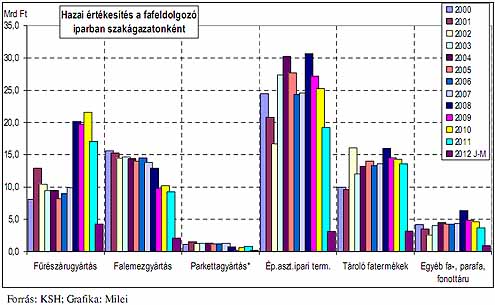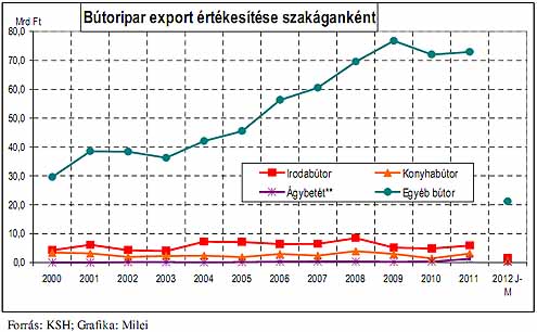 A fafeldolgozó-ipar termelése 2012 I. negyedévében 9,4%-kal emelkedett az egy évvel korábbi 8,6%-os növekedéshez képest. 2012 márciusában 8,4%-kal nőtt a termelés az el őző év 13,4%-os csökkenés bázisán. A szakágazat hazai értékesítése 2012 első három hónapjában 1,9%-kal, márciusban pedig 8,5%-kal csökkent. Az ez év januármárciusi exportértékesítés 18,8%-kal emelkedett a múlt évi 1,3%-os csökkenés bázisán, márciusban pedig a szakágazat kivitele 23,5%-kal növekedett az egy évvel korábbi 14,4%-os visszaesés bázisán. A hazai bútoripar 2009-ben kezdődött mélyrepülése 2012 első negyedévében megállni látszik. Az ágazat termelése 2,9%-kal emelkedett. A belföldi értékesítés változatlanul csökken (-5,9%) a múlt évi 3,2%-os csökkenés bázisán. Az export a január-márciusi id őszakban 6,9%-kal bővült, ezen belül márciusban 4,9%-kal nőtt az egy évvel korábbihoz képest.