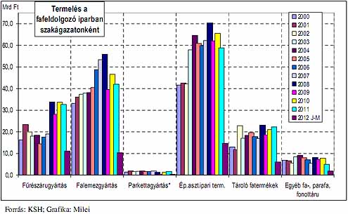 A hazai fafeldolgozó-ipar 2004-07 között lényegében követi a nemzetközi tendenciákat, 2008-ban azzal ellentétes irányba fordul, így a visszaesés 2009-ben sokkal erőteljesebb. 2010-ben követve a külpiaci tendenciákat, az EU átlagánál jelentősebb mértékű növekedést mutatott. 2011-ben igazodva a nemzetközi trendekhez a faipar termelése csökkent (-11,6%), mértéke azonban a korábbiakhoz hasonlóan lényegesen erőteljesebb mint az EU-27, vagy az EU-15 esetében. Az egyes negyedéveket tekintve a visszaesés üteme a harmadik negyedévig gyorsult, a múlt év utolsó negyedévében azonban jelentősen lefékeződött. 2012 I. negyedévében az európai tendenciákkal szemben 7,9%-os növekedést mértek a hazai faipar esetében. Bútorgyártásunk tendenciájában lényegében követi az európai folyamatokat a fordulatok azonban sokkal élesebbek, a csúcsok magasabbak, a visszaesések mélyebbek. Ennek a tendenciának a folytatását láthattuk 2010-ben is. A múlt év egyes negyedéveiben a csökkenés üteme lassult, az utolsó negyedévben pedig növekedésbe fordult. A bútorgyártás teljesítménye 2011-ben, az EU-s eredményekkel ellentétben, 0,8%-kal csökkent. Az éves összteljesítmény visszaesése lényegében a harmadik negyedévben bekövetkezett 6,9%-os termelés-csökkenésre vezethet ő vissza. Az év első felében, illetve a negyedik negyedévben az ágazat pozitív egyenleggel zárt. 2012 január-márciusban az ágazat termelése növekedett (2%), az előző év utolsó negyedévének pozitív tendenciáját folytatva.