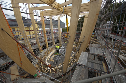 A kápolna ezen részeiben zajlik a munka, lelkészek és szociális munkások munkahelye ez. A belső térbe lépve gyönyörű íves, tiszta felülettel találkozunk. A szakrális tér tömörfából készült olajozott felülettel. Egyetlen ablaka sincs, így különösen alkalmas a világtól való csendes elvonulásra, a mennyezeti megvilágítás teszi igazán meghitté a belső teret. A berendezés, a padok és az "oltár" szintén nagyon puritán. Az épület teljes homlokzata hossztoldott lucfenyőből készült deszkaborítást kapott. A nanotechnológiával modifikált felületet pigmentált viasz felületkezeléssel védik az időjárás viszontagságaitól. Az épület konstruktív váza CNC-technológiával kialakított elemekből épült fel.