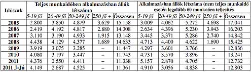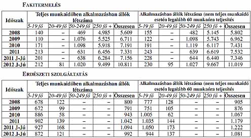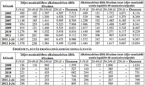 ERDŐGAZDÁLKODÁS 2012 I. félévében 41,3%-kal emelkedett a teljes munkaidőben foglalkoztatottak, 45,5%kal az alkalmazásban állók létszáma az előző év azonos időszakához képest. A jelentős növekedés mögött a közmunka programban állt, erre utal az is, hogy nagymértékű létszámnövekedést az 50-249 főt (+77,5%) illetve a 250 főnél többet foglalkoztató (+45,5%) vállaltok esetében regisztráltak. Ugyanakkor visszaesett a foglalkoztatás a mikró- és kisvállalkozások (-4,4%) esetében, míg a 20-49 főt foglalkoztató vállalkozásokban 18,6%-kal emelkedett a foglalkoztatás. Jelentős létszámnövekedést a fakitermelés (+51,5%) ágazatban mértek, míg az erdészeti szolgáltatás szakágazatban 9,3%-os visszaesést tapasztaltak.
