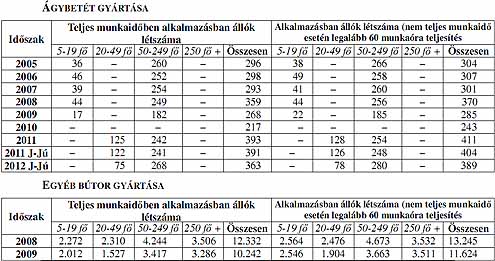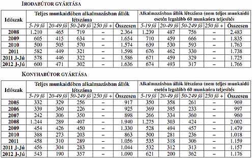 BÚTORIPAR Az alkalmazotti létszámot tekintve a teljes munkaidőben foglalkoztatottak teszik ki a létszám közel 90 százalékát. Az összes foglalkoztatotti létszámban ingadozások a konjunktúra függvényében tapasztalhatók. A 2009-ben és 2010-ben bekövetkezett létszámcsökkentés megállt, 2011-ben a bútoripar egészében 3,8%-kal emelkedett az alkalmazásban állók, és 5,8%-kal a teljes munkaidőben foglalkoztatottak létszáma. 2012 els ő hat hónapjában ismét létszámcsökkenés következett be az ágazat egészében. A csökkenés az egyéb bútor gyártása, illetve az ágybetét gyártása alágakban bekövetkezett visszaesésre vezethető vissza.