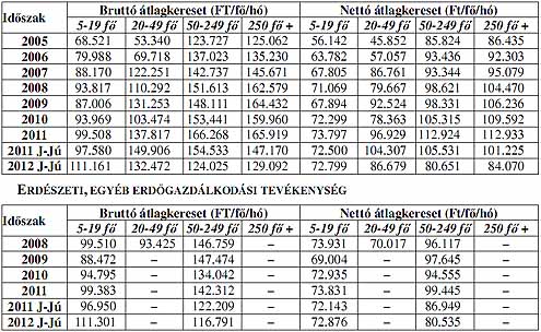 ERDŐGAZDÁLKODÁS Az erdőgazdálkodással foglalkozó vállalkozások kereseti adatai szerint sem a bruttó, sem a nettó keresetek nem érik el a versenyszféra átlagát, nemzetgazdasági szinten a legalacsonyabbak közé tartozik. 2011-ben a bruttó kereset 4,5%-kal, a nettó keresetek 3,4%-kal emelkedtek. 2012 I. félévében a bruttó átlagkereset 9,8%-kal, a nettó átlagkereset 15,3%-kal csökkent. A bruttó keresetek az erdészeti szolgáltatás alágat kivéve csökkentek 2011 első félévéhez képest. Ugyanakkor a nettó keresetek valamennyi alágban visszaestek az új adózási rend következtében, de közrejátszhatott a közfoglalkoztatás keretében alkalmazottak alacsonyabb bérszintje is.