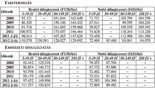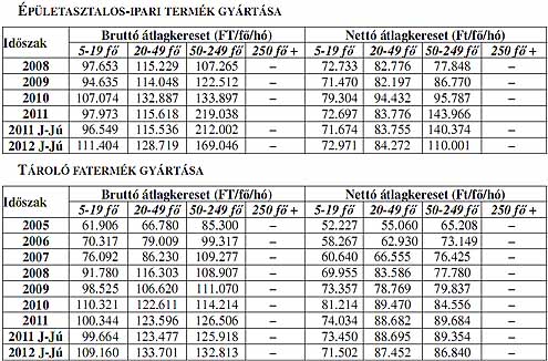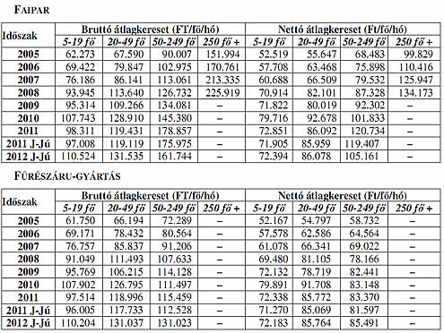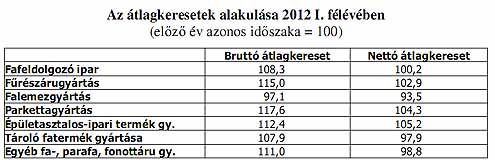 A rendelkezésre álló adatok alapján 2009-től a fafeldolgozó ipar vállalkozásaiban mind a bruttó, mind a nettó keresetek jelentősen elmaradnak a nemzetgazdasági átlagtól. 2011-ben a bruttó keresetek 4,6%-kal, a nettó átlagkeresetek 4,4%-kal csökkentek az egy évvel korábbihoz képest. 2012 január-júniusban az ágazatban a bruttó átlagkereset 8,3%-os növekedése mellet a nettó átlagkeresetek 0,2%-kal emelkedtek. Figyelembe véve az első félévi 5,6%-os inflációt az ágazatban a reálbérek 5,4%-kal visszaestek. Az alágazatok közül egyben sem volt olyan mértékű béremelés, mely a reálbérek emelkedését eredményezte volna. Kiemelked ően rossz a bérhelyzet a falemezgyártásban, ahol a bruttó átlagkereset 2,9%-kal, a nettó átlagkereset 6,5%-kal csökkent.