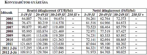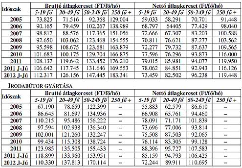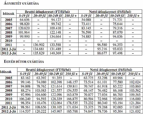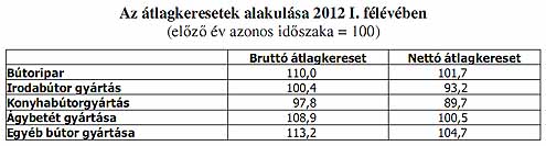 BÚTORIPAR A bútoripar vállalkozásai esetében egyik létszám kategóriában sem érik el a keresetek a versenyszféra átlagát, még a legtöbb alkalmazottat foglalkoztató kategóriában is 20%-os elmaradás mutatkozik. 2011-ben a bruttó keresetek 5,6%-kal, a nettó keresetek pedig 3,2%-kal emelkedtek. 2012 I. félévében a bútoriparban foglalkoztatottak bruttó átlagkeresete 10, nettó átlagkeresete 1,7%-kal emelkedett. Az 5,6%-os inflációt figyelembe véve a reálkeresetek 3,9%-kal mérsékl ődtek. Az egyes alágak közül nettó átlagbér-emelkedés lényegében csak az egyéb bútorok gyártása alágban volt, azonban ennek mértéke sem érte el az els ő féléves infláció nagyságát.