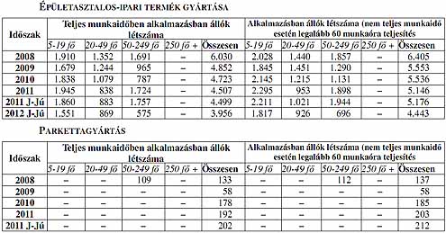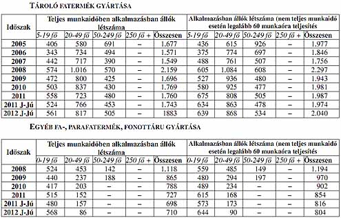 FAFELDOLGOZÓ IPAR A 2011 január-júniusi 0,7% létszámcsökkenést követően ez év első félévében további 3,5%-os visszaesés ment végbe a fafeldolgozó ipar egészében. Ezen belül a 20-49 fős vállalkozások esetében a létszám az előző évi 15,4%-os csökkenést követően 2012 I. félévében 5,2%-kal emelkedett. Az 50-249 fős vállalkozások esetében 33,8%-os csökkenés ment végbe a múlt évi 37%-os növekedés bázisán. Az ágazat hat alágából háromban emelkedett a teljes munkaidőben alkalmazottak (1,7-8,0%), kettőben pedig az alkalmazásban állók létszáma (1,5-3,3%), háromban, illetve négyben pedig csökkenést regisztráltak (Parkettagyártás: -4, ill. -4,2%; Épületasztalos-ipar: -12,1, ill. -14,2%; Falemez ipar: -10,7, ill. -11,4%, valamint Egyéb fa-, parafatermék, fonottáru: +1,7%, ill. - 1,5%).