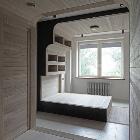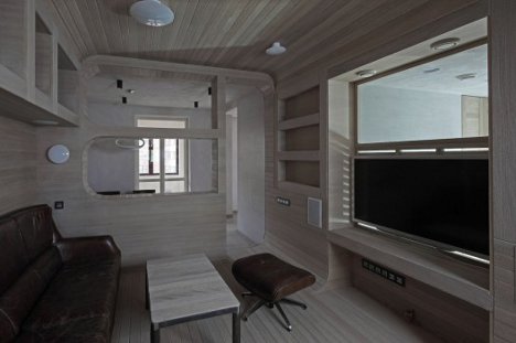 A lakás középső részét is padló-, fal- és mennyezetburkolattal látták el tölgy burkolódeszkából, amely megoldás a lekerekített hajlatok révén csőszerű megjelenést nyújt a lakótér egyik végétől a másikig tartóan. A megoldás segít a fény "megtartásában", és az olyan helyre történő irányátásában, amely korábban szinte egyáltalán nem kapott megvilágítást.