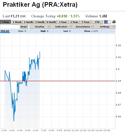 A Praktiker menedzsmentje által támogatott kilábalási terv szerint az amerikai Anchorage befektető csoport egy 60 millió eurós tőkeemeléshez kötve 85 millió eurós hitelt ad a Praktiker részvények 15 százalékának vételi opciójáért. Ami az 1,08 eurós részvényárat illeti, a cég igen alacsonyra értékelte magát, hiszen a tőzsdén szeptember eleje óta ennél magasabb árfolyamon forogtak a papírok. Igaz, a tavaly márciusi 8 eurós szint ma már elképzelhetetlen a cég számára, de az augusztus 28-i mélypont, a 0,95 euró alaposan megijesztette a cég vezetését. Forrás: vg.hu |