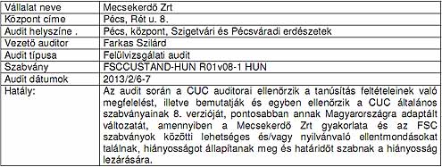 A Control Union Certifications (CUC) ezúton közzéteszi, hogy tanúsító auditot hajt végre a FSCCUSTAND-HUN R01v08-1 HUN (A CUC magyarországi kiértékelésekre adaptált erdőgazdálkodási szabványai) szabvány alapján. Ez a szabvány erről a linkről megnyitható.