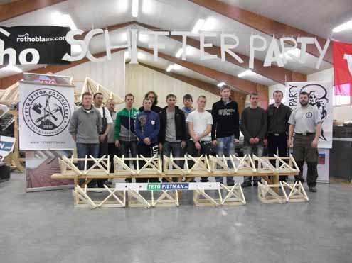 A második Schifter-party-n a korábbi évben kipróbált lépéseken voltaképpen nem kellett változtatni. A résztvevők péntek reggel-délelőtt érkeztek, a korábban érkezők berendezték a műhelyt, előkészítették a szükséges anyagokat és eszközöket. A jól felszerelt műhelyben ez hamar megtörtént, és már ebéd előtt elkezdődött a munka. A résztvevők mindahányan kaptak egy füzetet, amiben a kész szerkezetről készült rajzok, anyaglista, valamint a szerkesztés lépései találhatók. A magyarázatokat Hantos Zoltán, a nemzetközi ács versenyek magyarországi szakértője adta, kivetített előadással. A résztvevők (oktatók és diákok közösen) az instrukciók alapján haladtak a rajzzal illetve a megmunkálással. Az első napon a rajz főbb körvonalai és a készülő tetőcske szelemenjei, oszlopjai készültek el, és egy-egy szarufa is. Nem a sebesség volt a lényeg, inkább a maradandó ismeret. A vacsora, mint szertartás része a műhely összetakarítása, hiszen a csapat ott eszik, ahol dolgozik.