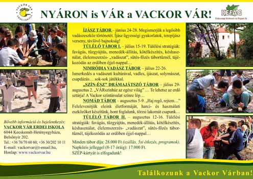 A (kattintással nagyítható) képeken az idén 10 éves Vackor Vár Erdei Iskola tavaszi és nyári táborai, melyre "szülinapi" árakon várjuk a 8-18 éves gyermekeket!