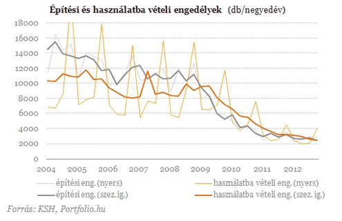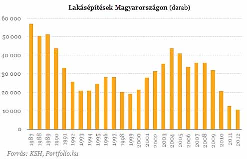 Már negyedik éve tart a lakásépítések folyamatos csökkenése. 2009-ben Budapesten még annyi lakás épült (10 385), amennyi most az egész országban összesen. A válság előtt, 2008-ban 17 ezer lakást építettek a vállalkozások, 2012-ben alig több mint 3 ezret. Az elmúlt évek gyors visszaesését követően a lakásépítések és az építési engedélyek száma 2012-ben lassuló ütemben csökkent. 2011-ben még 39, 2012-ben már csak 17 százalékkal maradt el az épített lakások száma a megelőző évitől. A kiadott új építési engedélyek esetében az egy évvel korábbi 28 százalékos csökkenés után 2012-ben valamivel mérsékeltebb, 15 százalékos visszaesést figyelhettünk meg.