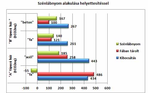 Minden termék teljes életútja több szakaszból áll (pl. ház esetében: gyártás-építés, használat-felújítás és életút végi bontás-hulladékkezelés), ezért a tényleges helyettesítési potenciál meghatározásához az összes szakasz ÜHG kibocsátásait figyelembe kell venni. A hagyományos építésű házak szénlábnyoma mindig pozitív és annál nagyobb minél energiaintenzívebb alapanyagból készül. Ezért a faszerkezettel történő helyettesítésnek is akkor van nagyobb hozadéka, ha ezeket a nagy energia igényű elemeket helyettesítjük. Az alábbi példában két családi ház ("A" típus kétszintes 192 m2, "B" típus egyszintes 200 m2) esetében 75 éves élettartamot figyelembe véve, teljes életútelemzéssel (LCA) vizsgálták meg a helyettesítési potenciál alakulását. Az "A" típusú háznál acél helyett használtak faanyagot, míg a "B" típusú háznál könnyűbeton helyett. A változatok szénlábnyomának alakulását egyszerű diagram mutatja.