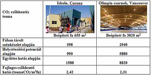 A bemutatott példában az alkalmazott faanyag helyettesítési potenciálja alapján "A" típusnál 240 tonna, míg "B" típusnál 27 tonna ÜHG kibocsátás csökkentés érhető el. A példából az is kiderül, hogy helyettesítéssel akár negatívba is fordítható a szénlábnyom ("A" típusú ház), ami itt is CO2 nyelő hatást jelent! Faanyag használata az építészetben kettős CO2 csökkentő hatást kínál. Egyrészt a fatermékekben tárolt szénkészlet alapján (mely témát egy korábbi FATÁJ cikkben már elemeztünk) másrészt a most tárgyalt helyettesítési potenciál alapján. Alábbi táblázatban két esttanulmány, egy iskola és egy sportcsarnok példáján mutatjuk be miképpen alakult, és milyen számottevő ez az együttes hatás. Az adatok alapján azt is állíthatjuk, hogy 1m3 faanyag építészeti felhasználása 2,0 - 3,0 tonna ÜHG kibocsátás csökkentést is hozhat. Érthető tehát, hogy a faépítészetben élenjáró országok szorgalmazzák leginkább ennek a csökkentési lehetőségnek az elismerését a nemzeti ÜHG leltárban (NIR). Realizálásához azonban még sok minden hiányzik, elsősorban egy elfogadott nemzetközi egyezmény. Hazánkban pedig leginkább a faépítészet fellendítését akadályozó gazdasági helyzet, valamint a meglehetősen merev jogi, műszaki és fogyasztói hozzáállás jelent további korlátokat.