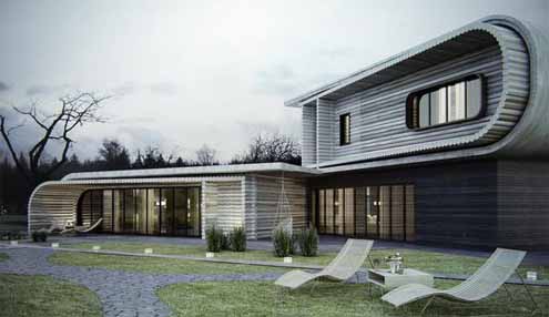 Az ívelt tető és a nagy faszerkezet együttesen rendkívül dinamikus benyomást hoz létre a szemlélőben. Úgy tűnik, mintha a ház szinte ellebegne a földtől - a terek szétfolynak, ám mégis sarkosan találkoznak.