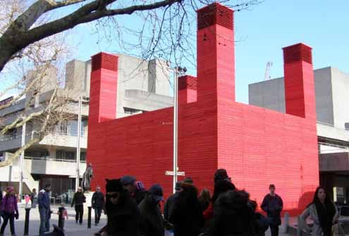 London központjában a Temze déli partján, a többnyire csak Southbank-nak nevezett területen az 1951-es Festival of Britain rendezvénysorozatra elkészült Royal Festival Hall és Queen Elizabeth Hall & Purcell Room, a Waterloo-híd alá szorult British Film Institut, valamint a National Theatre épületeinek egymás vonzerejét erősítő együttese a brit főváros legfontosabb kulturális központját alkotják. Az 1977-ben elkészült színház előtti kis teresedésen most egy pirosra festett deszkadoboz hívja fel magára a figyelmet égnek meredező saroktornyaival. A kései brutalista szomszéd deszkazsaluzatos nyers beton homlokzati megjelenését visszatükröző építmény a nemzeti ideiglenes előadótermét rejti magában. Figyelemfelkeltő megjelenésén kívül további érdekesség, hogy természetes szellőzéssel oldották meg a légcserét, amiben a négyzetes hasáb sarkain elhelyezett szellőzőkürtők segítenek. Ennek eredménye a felfordított hokedli, mint egykor nagyszüleinknél felmosáskor a konyhában az asztal tetején.