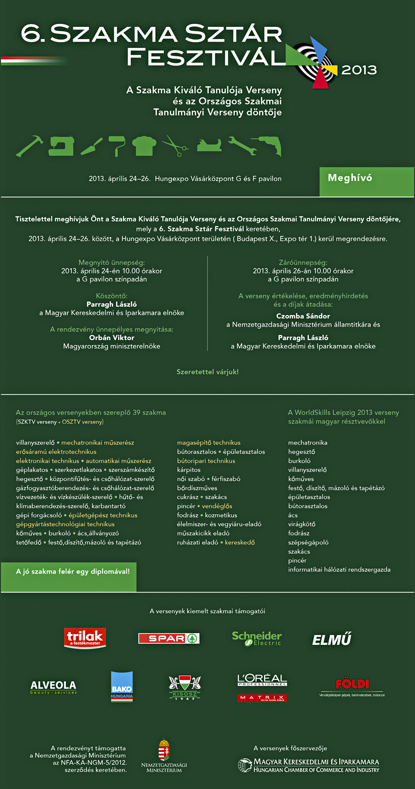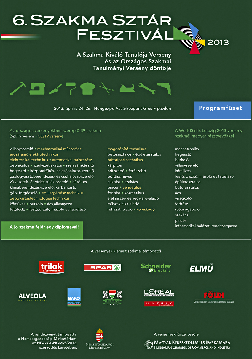 Ezek országos döntőjére, 39 szakmában az VI. Szakma Sztár Fesztivál keretében 2013. április 24-26. között Budapesten, a Hungexpo Vásárközpont G és F pavilonjában több mint 13 ezer m2-en kerül sor.