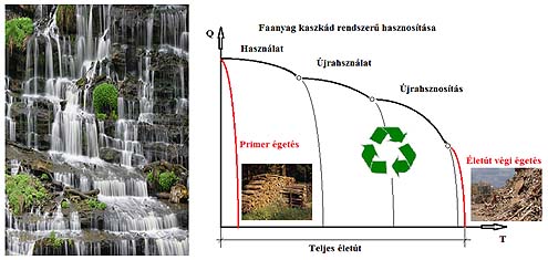 A faanyag égetésének azonban van egy, az energiahordozó helyettesítésnél mutatkozó kétségtelen előny elismerése mellett, egy szélesebb értelembe vett ökológiai, ökonómiai és szociális megközelítésből fakadó negatív megítélése is. Amikor ugyanis az erdőből kikerülő faanyagot első használatban azonnal elégetjük, egyetlen egy cél, energia nyerése érdekében, akkor teljes mértékben veszni hagyjuk mindazokat a műszaki, esztétikai, szociális, ökológia értékeket (köztük a klímavédelemben, e sorozatban már korábban kitárgyalt, lehetséges szerepeket is) melyeket betölteni képes lenne. Ha el akarjuk kerülni ezt a racionális gondolkodásra alkalmas ember számára méltatlan helyzetet, akkor a faanyag égetésére csak az anyagában történő hasznosítás után kerülhetne sor. Tehát annak a kétségtelen realitásnak a belátása mellett, hogy a faanyag primer égetésének térben és időben midig is volt és várhatóan lesz is aktualitása, biztosítani kell jogi és gazdasági eszközökkel az anyagában történő hasznosítás prioritását. A faanyag sok szempontból, de ökológiailag mindenképpen, ideális égetésének a helye ugyanis a kaszkád rendszerben meghosszabbított teljes életút végén van. Kaszkád rendszer azt az anyaghasznosítási módszert jelenti, melyben az anyag potenciális képességeit több egymás után rendezett felhasználási lépcsőben fokozatosan merítjük ki. (Valahogy úgy, ahogy a víz veszíti el helyzeti energiáját egy lépcsős vízesésnél.) Fából készült termékeknél erre a kaszkádozásra különösen jó lehetőségünk van az újrahasználat (reuse) az újrahasznosítás (recycling) mára már ismert és bevált technológiai módszereinek segítségével.