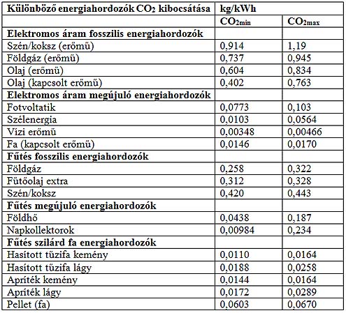 A teljes életút alatti ÜHG kibocsátás mértékének meghatározásához tehát most ismét az életciklus elemzés (LCA) segítségére van szükségünk. Szerencsére az életciklus elemzések azt mutatják, hogy fa szilárd energiahordozóknál az ÜHG kibocsátás meglehetősen kismértékű. Az alábbi táblázatban erre találunk adatokat (EcoInvent-Swiss Centre for Life Cycle Inventories, Datenbank 2005) és ugyanakkor összehasonlítást is tehetünk más megújuló és fosszilis energiahordozókkal is. Konkrét helyettesítés esetben azonban mindig körültekintően kell eljárnunk, mert az energia célra szánt fa ÜHG mérlegében több tényező is fontos szerepet játszik, mint pl. a szállításból adódó, valamint a tüzelőberendezések méretétől, típusától, üzemeltetésétől, a helyi adottságoktól, stb. függő kibocsátás. Ezekből adódó átlagos eltéréseket a táblázat minimum és maximum értékekkel igyekezett feltüntetni.