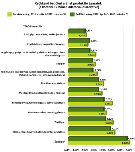 Jól látszik, melyek azok az ágazatok, amelyeket továbbra is sújtanak az évek óta tartó gazdasági válság hatásai: a korábbi 12 hónap adataival összehasonlítva 2012. április 1-je és 2013. március 31. között valamelyest tovább nőtt az élelmiszer, ital és dohánytermék gyártásával, a gépjármű kereskedelemmel, a kiskereskedelemmel és a többi között a vendéglátással foglalkozó cégek bedőlési aránya - derül ki a Bisnode üzleti információs szolgáltató legfrissebb elemzéséből. A számítógépek, elektronikai termékek és a bútorgyártás területén is romlott a helyzet némileg.