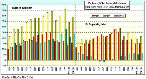 A fa alapanyagok 2012 I-III. negyedévi külkereskedelmi forgalma pozitív 2012. január-szeptemberben a bútor és bútorelem behozatal 21,3%-kal bővült. Az árucsoport kivitele a vizsgált idő szakban 21,9%-kal emelkedett az egy évvel korábbihoz képest. Az árucsoport egyenlege 20 milliárd forinttal kedvező bben alakult, mint az előző évben.