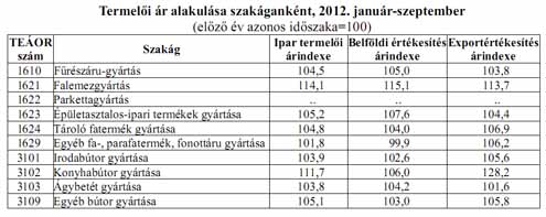 A fafeldolgozó ipar termelői ára 2012 január-szeptemberben 7,6%-kal volt magasabb az egy évvel korábbinál. A belföldi értékesítési árak 6,7%-kal, az export értékesítés árai 8,1%-kal haladták meg az egy évvel korábbit. A bútoripar termelői ára 2012 I-III. negyedévében 5,2%-kal emelkedett az egy évvel korábbihoz képest. Ezen belül a hazai értékesítés árszintje 2,6%-kal, az exporté pedig 5,6%-kal emelkedett a 2011 azonos idő szaki árszinthez képest.