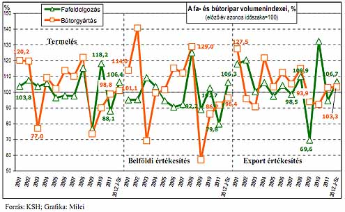 A hazai fafeldolgozó-ipar 2004-07 között lényegében követi a nemzetközi tendenciákat, 2008-ban azzal ellentétes irányba fordul, így a visszaesés 2009-ben sokkal erő teljesebb. 2010-ben követve a külpiaci tendenciákat, az EU átlagánál jelentő sebb mértékű növekedést mutatott. 2011-ben igazodva a nemzetközi trendekhez a faipar termelése csökkent (-11,6%), mértéke azonban a korábbiakhoz hasonlóan lényegesen erőteljesebb mint az EU-27, vagy az EU-15 esetében. Az egyes negyedéveket tekintve a visszaesés üteme a harmadik negyedévig gyorsult, a múlt év utolsó negyedévében azonban jelentősen lefékező dött. 2012 egyes eddigi negyedéveiben - az európai tendenciáktól eltérő en - jelentő s növekedés ment végbe (I.: 8,2%, II.: 5,8%, III.: 6,1%).