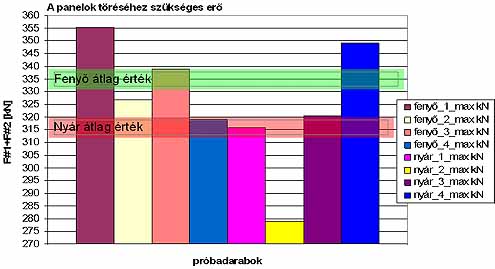 Leolvasható, hogy a nyár és a fenyő panelok között is előfordul kimagasló érték. Még a legkisebb szilárdsággal rendelkező nyár 2-es panel is 279 kN azaz 27,9 tonna terhelésre ment tönkre. A nagyságrendhez képest nem olyan ijesztőek a különbségek, mint ahogy azt első ránézésre az ábra alapján gondolnánk. A fenyők átlag értéke 335 kN, ami 33,5 tonnát jelent. A nyárak átlag értéke 316 kN, ami 31,6 tonna terhelésnek felel meg, ami nem jelentős különbség.