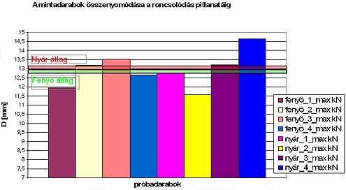 A következő ábra mutatja be az összenyomódások mértékét mm-ben. A vízszintes sávok jelezte átlagok ebben az esetben majdnem fedik egymást. Ezt azonban úgy kell figyelembe venni, hogy a nyár panelok átlagosan kisebb törőerő hatására nyomódtak össze ennyire.